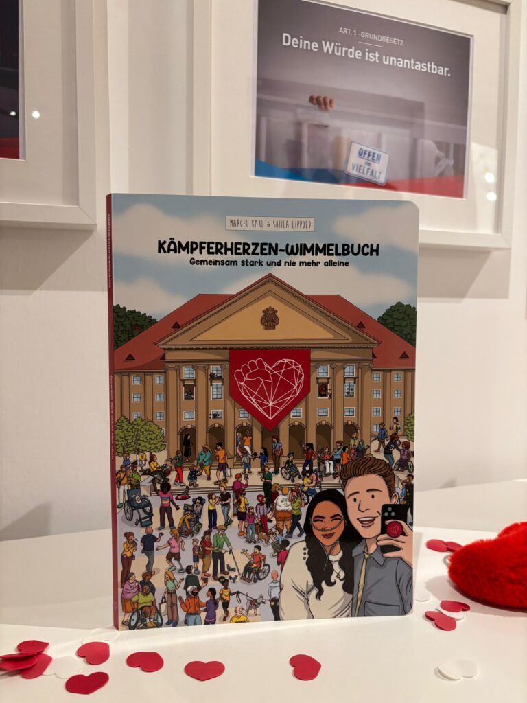 Am Internationalen Tag der Menschen mit Behinderung fand eine ganz besondere Veröffentlichung statt: In unserem Demokratie-Laden wurde das neue „Kämpferherzen-Wimmelbuch – Gemeinsam stark und nie mehr alleine“ vorgestellt. Entwickelt wurde es von Autor Marcel Kahl, der von unserem Verein bereits als Vielfalt Verstärker ausgezeichnet wurde.