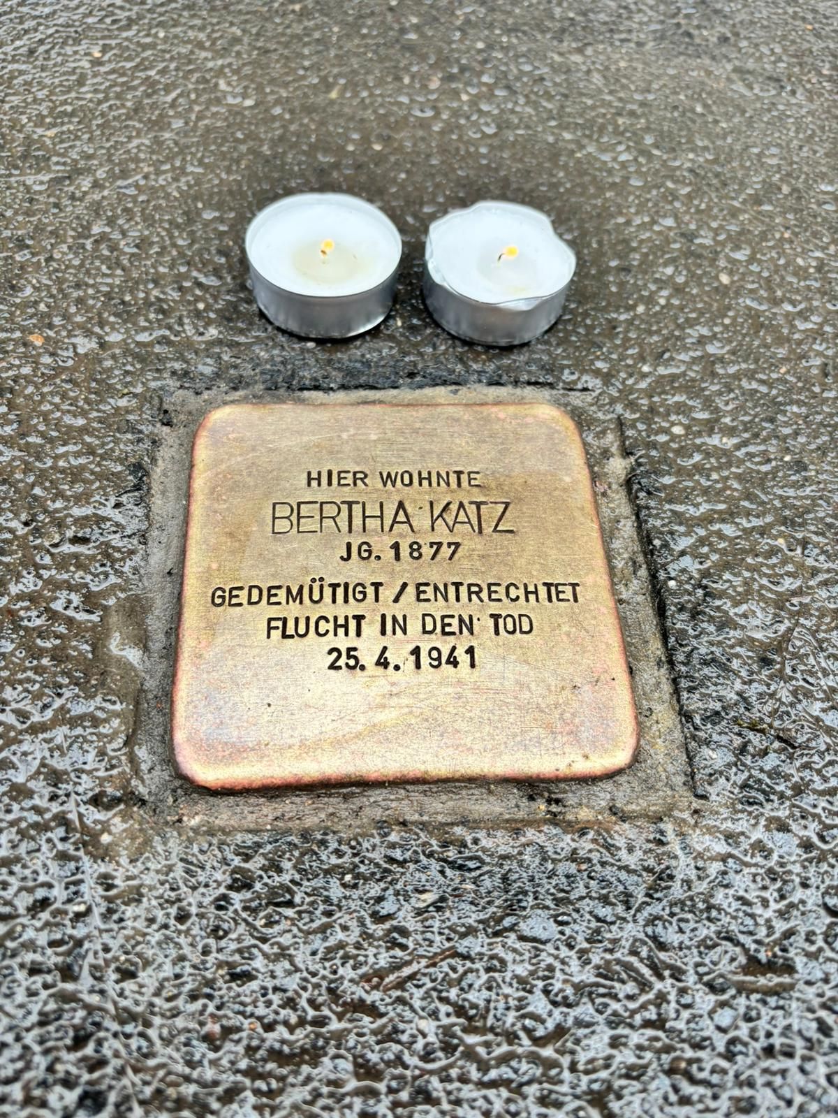 Heute, am Holocaust Remembrance Day (27. Januar), hat Offen für Vielfalt e.V. Lichter für Bertha Katz angezündet und ihren Stolperstein gereinigt.